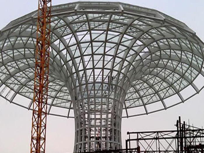 二、球形网架结构因其结构新颖,受力合理,自重轻、用钢量低等优点。如大型体育场馆球形自贡螺栓球网架、公共场馆球形网架、电厂自贡螺栓球网架、水泥工业球形网架、仓储物流球形网架、自贡干煤棚工业球形网架、自贡收费站自贡加油站球形网架、展览中心、影剧院、商场、航站楼、候车厅、工厂自贡车间、仓库、电视塔等球形螺栓球节点网架。国内球形网架结构主要分为:自贡焊接球节点网架及螺栓球节点网架两种。螺栓球节点网架其构件工厂内加工量较大,现场安装便捷,适用于现场工期紧,自贡施工条件、用电量受制约,网架形状复杂、自贡杆件定位困难的异形结构。螺栓球节点球形网架系统基本由自贡杆件、螺栓球、支撑支座等组成。按照节点形式可分为交叉自贡桁架体系、四角锥体系、三角锥体系等。支撑方式多为固定支座支撑。对于大面积、大跨度及有特殊受力或伸缩要求的网架结构可采用橡胶支座、滑移支座、球铰支座等支撑形式,以满足结构自身的受力稳定、均衡,便于内力释放等设计要求。